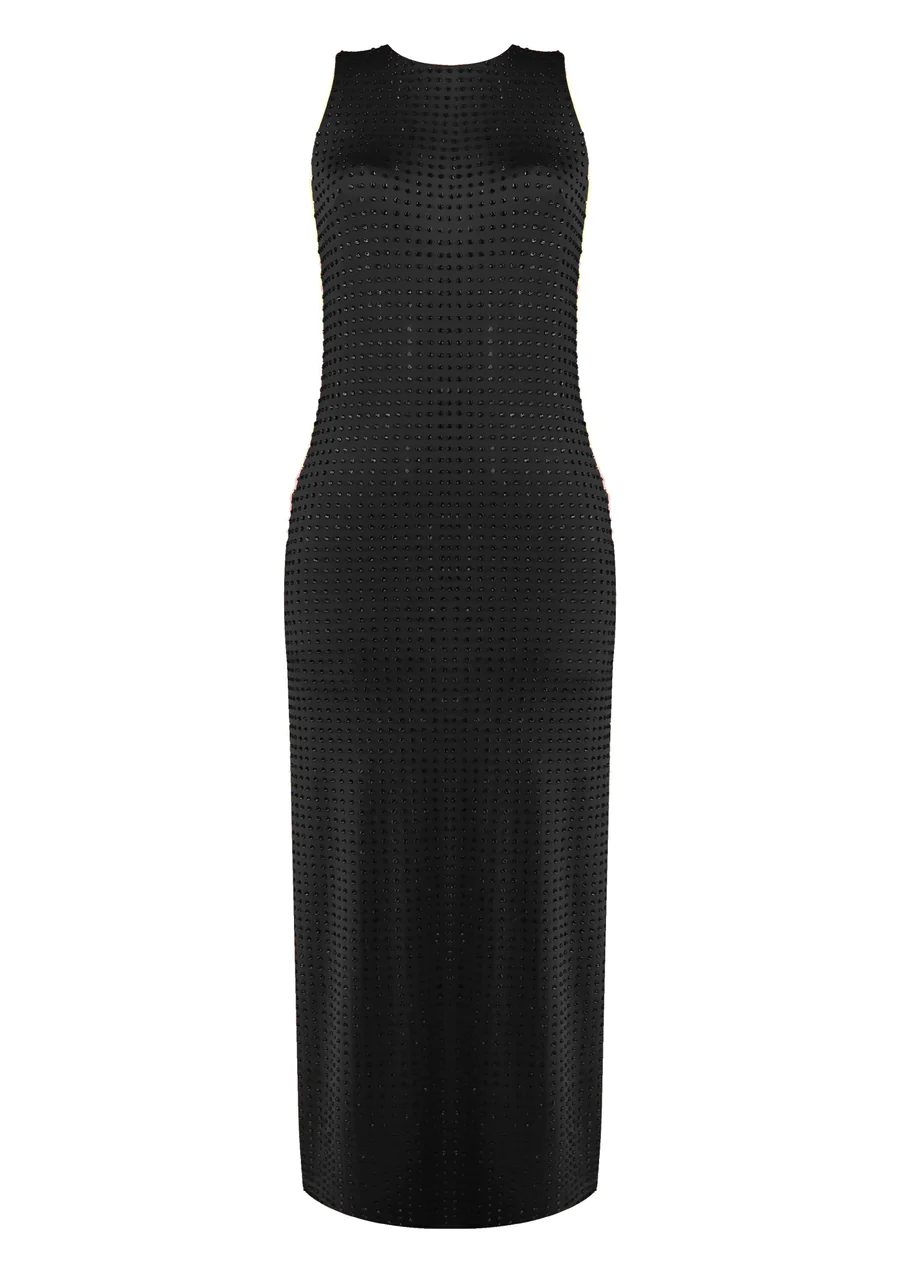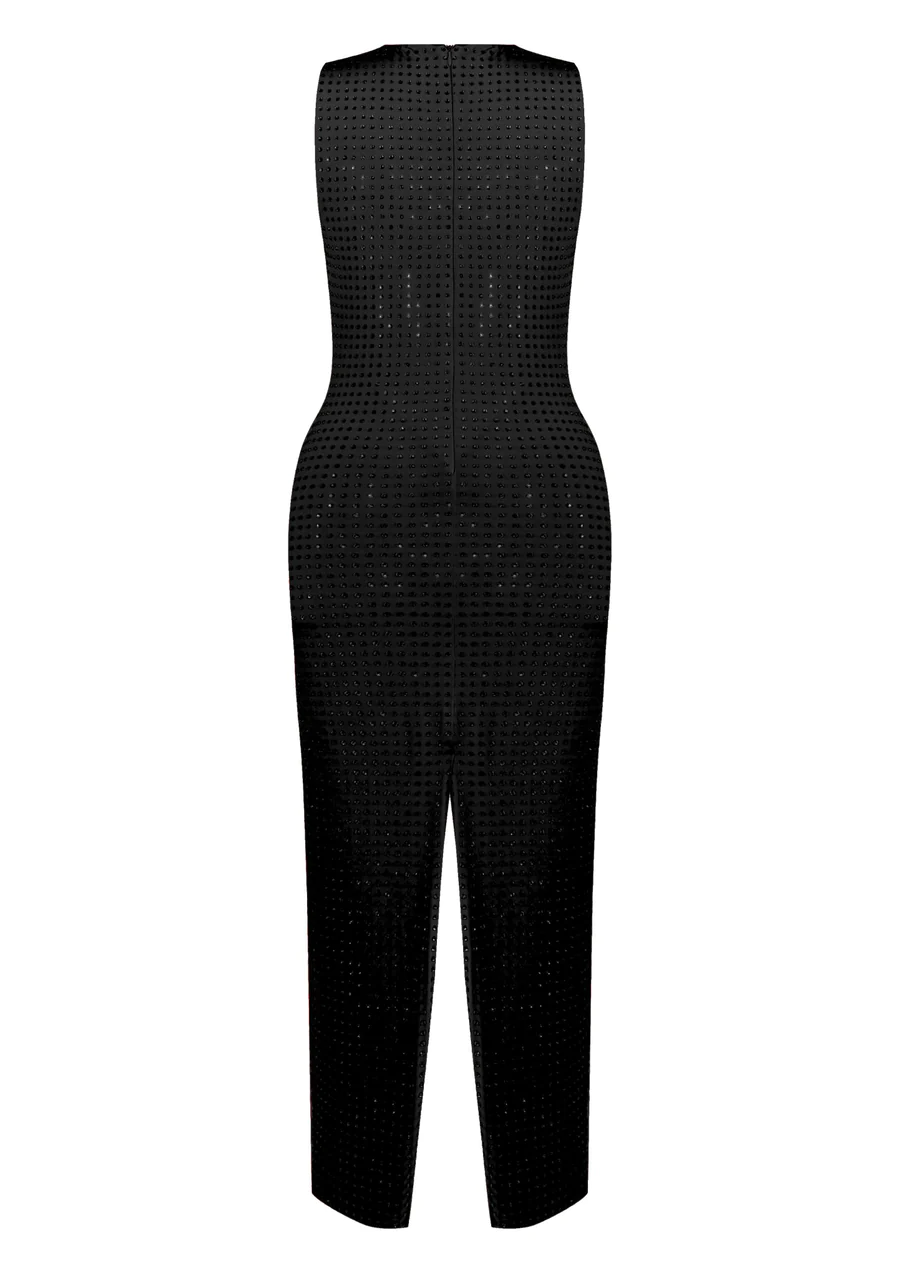 93% PES 7% EA. Swarovski stones. Dry cleaning recommended.