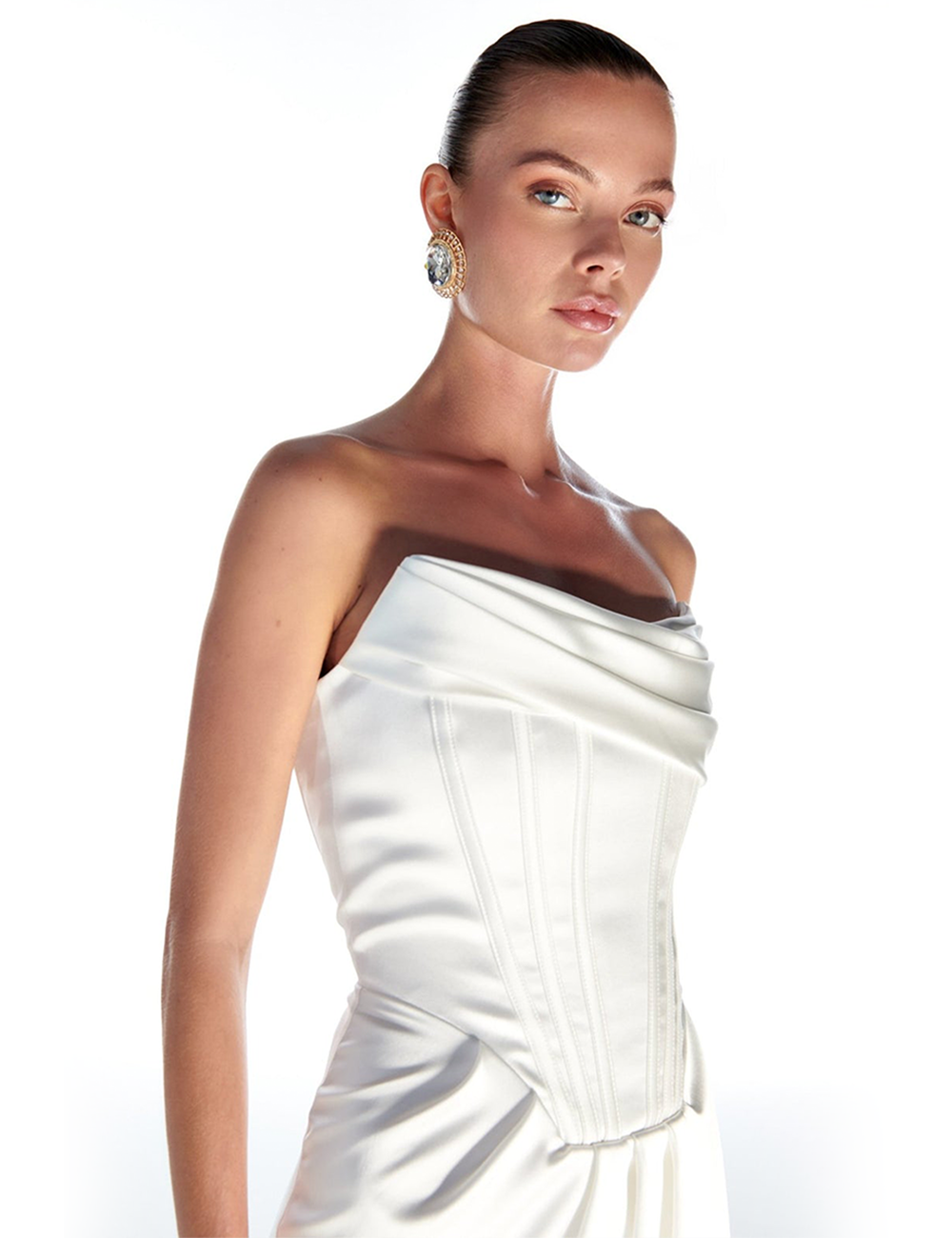 White Satin Underwire Slit Maxi Dress SHOW SATIN 97% Polyester 3% Lycra Dry cleaning recommended.
